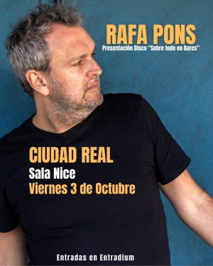 Rafa Pons vuelve a CIUDAD REAL un año después de su maravilloso concierto en la Sala Nice. Rafa está celebrando sus 18 años de carrera y lo hace con un lanzamiento discográfico "Sobre todo en Bares" que es un disco grabado en 15 salas en España, Argentina y Andorra en las que puedes disfrutar de la versión acústica de sus giras y de sus temas clásicos con un sonido natural y puro en el que las melodías de 18 canciones (una de ellas inédita) se entremezclan entre risas, coros y vasos brindando. Las canciones de siempre, alguna sorpresa y el buen rollo habitual. Existe una entrada especial con la que al comprar cuatro, la quinta es gratis. LAS ENTRADAS NO TIENEN GASTOS DE GESTIÓN